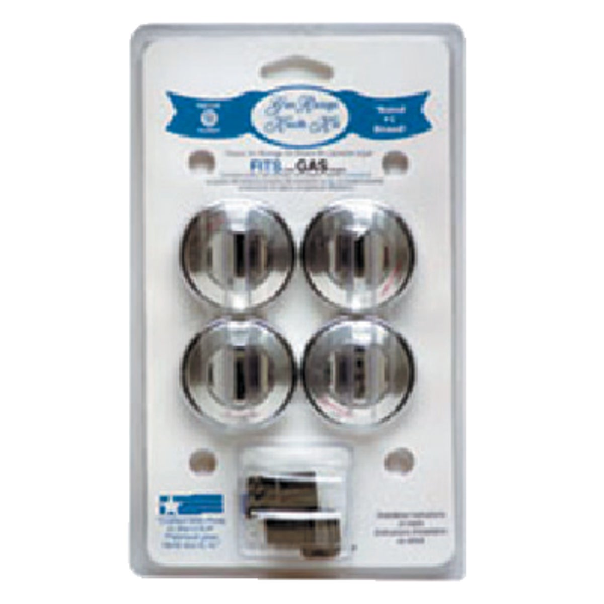 "Universal fit. Fits most gas ranges. Includes: 4 knobs, 4 Chrome overlays (""OFF"" marking only) and 8 most adapters. No. 8214: Finish: Black, Size: Universal, Pkg Qty: 4, Package Type: Clamshell No. 8224: Finish: Chrome, Size: Universal, Pkg Qty: 4, Package Type: Clamshell No. 8234: Finish: White, Size: Universal, Pkg Qty: 4, Package Type: Clamshell"